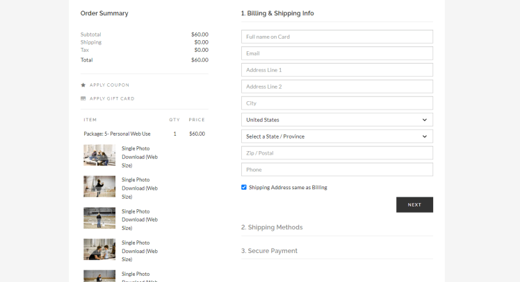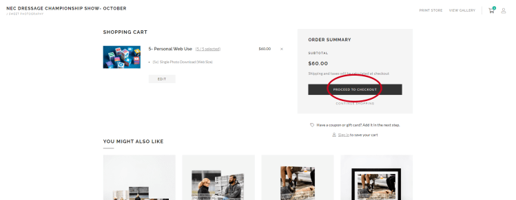 After you have selected all of your images and the package says (for this example 5/5 selected), then proceed to checkout.